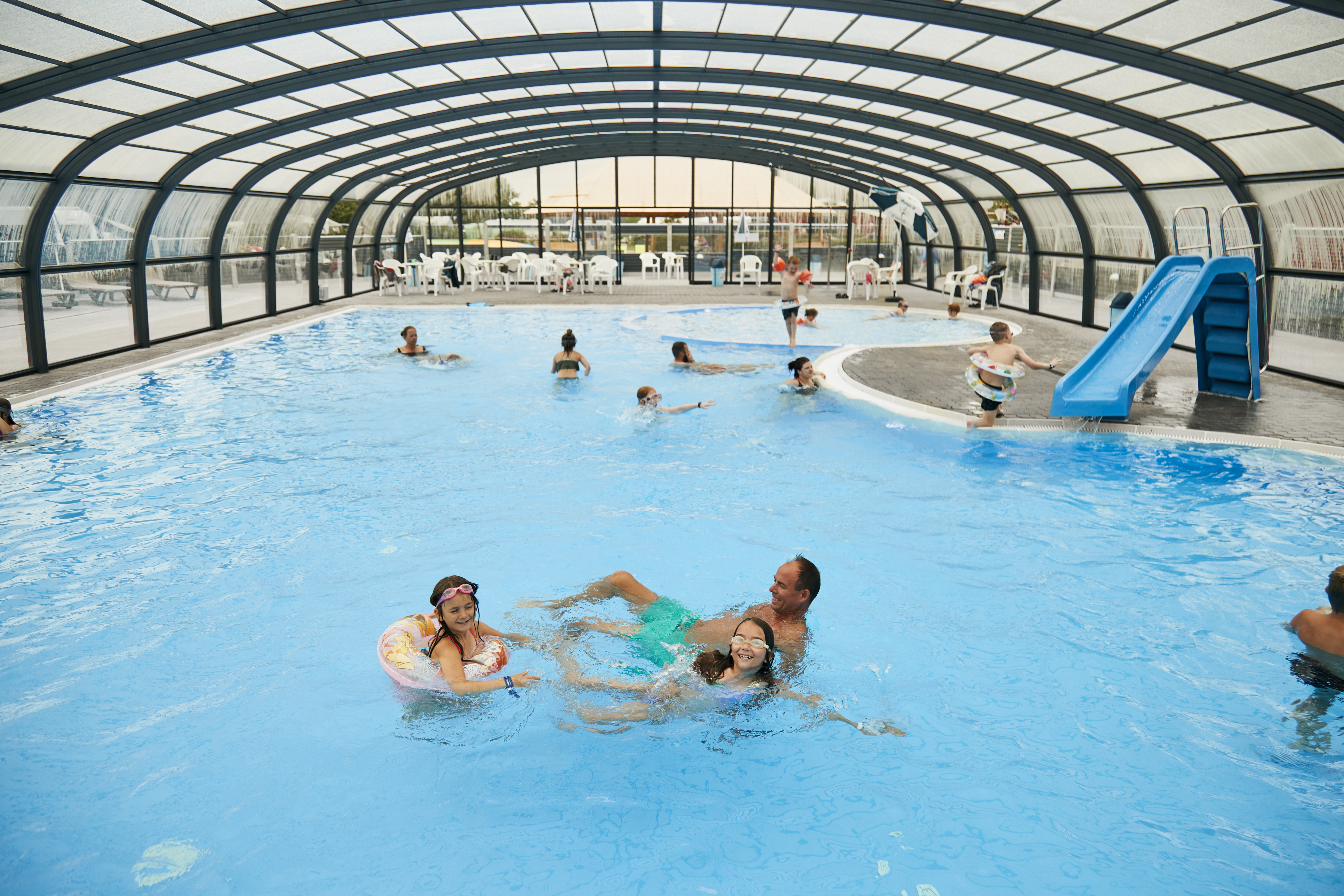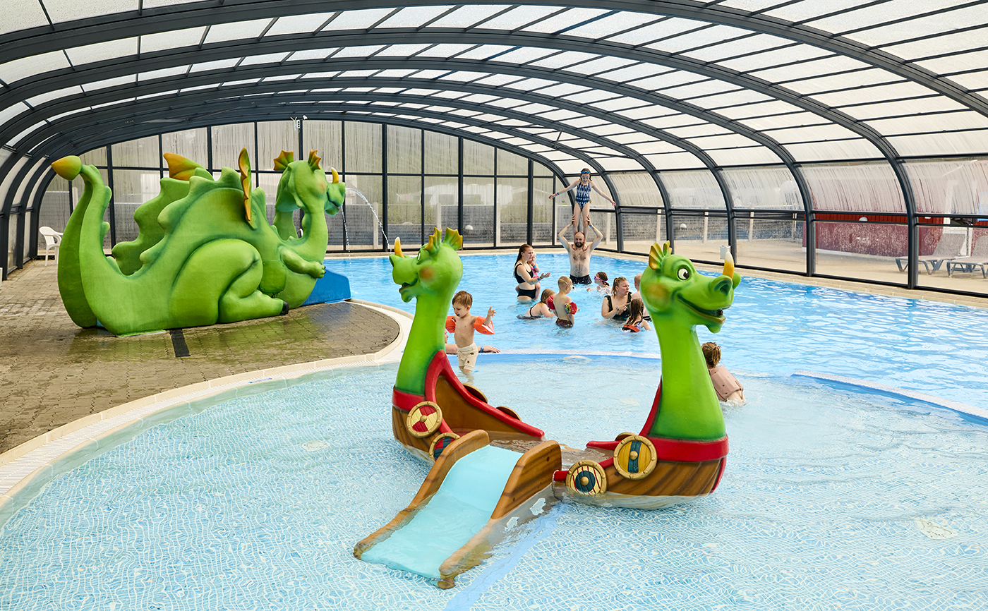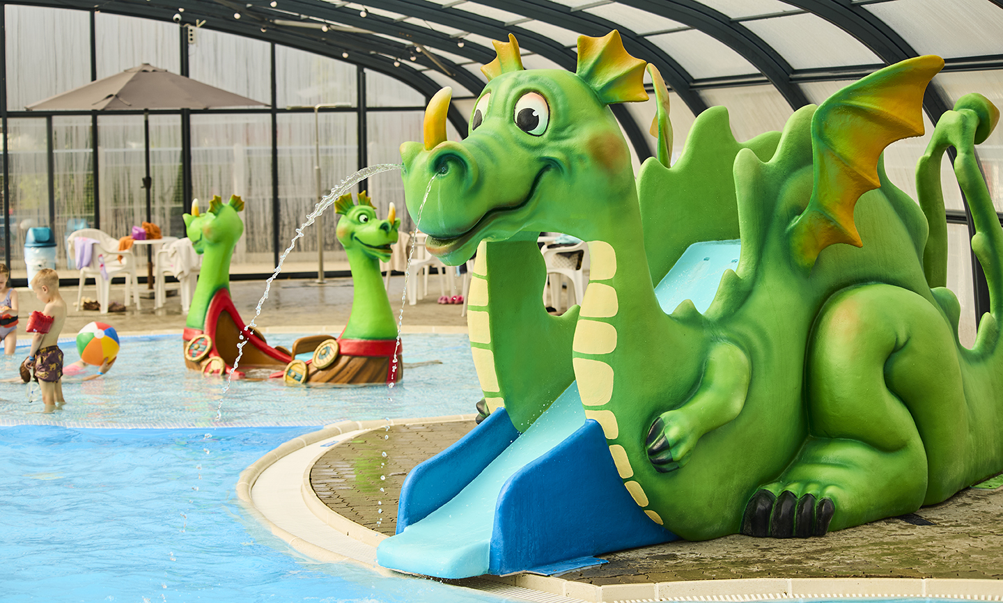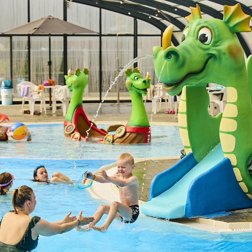 Pladsens overdækkede swimmingpool er opvarmet med solceller og holder minimum 27 grader, så den kan benyttes uanset vejret. For de mindste er der et sjovt badeland, som indbyder til leg og vandpjask hele dagen.