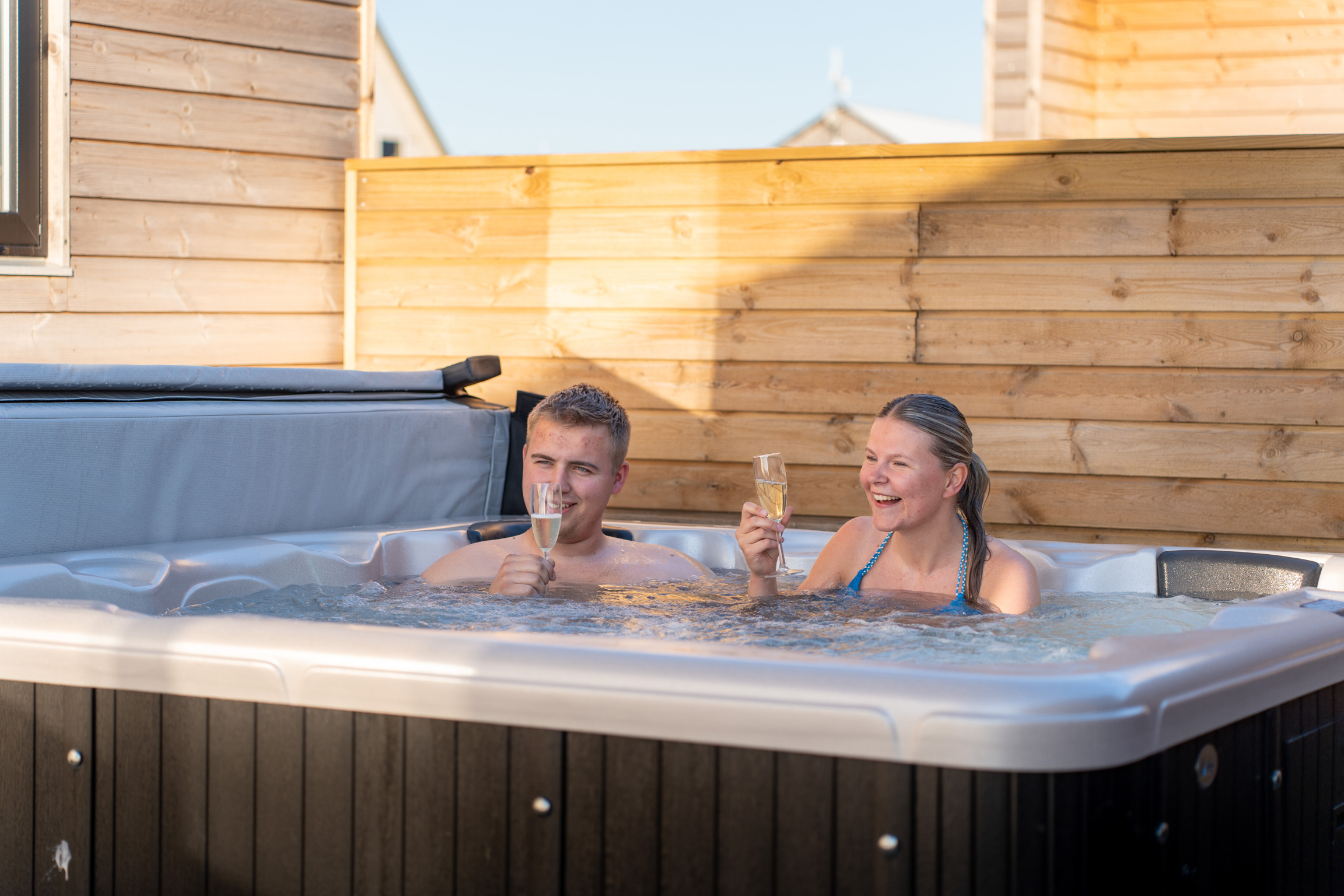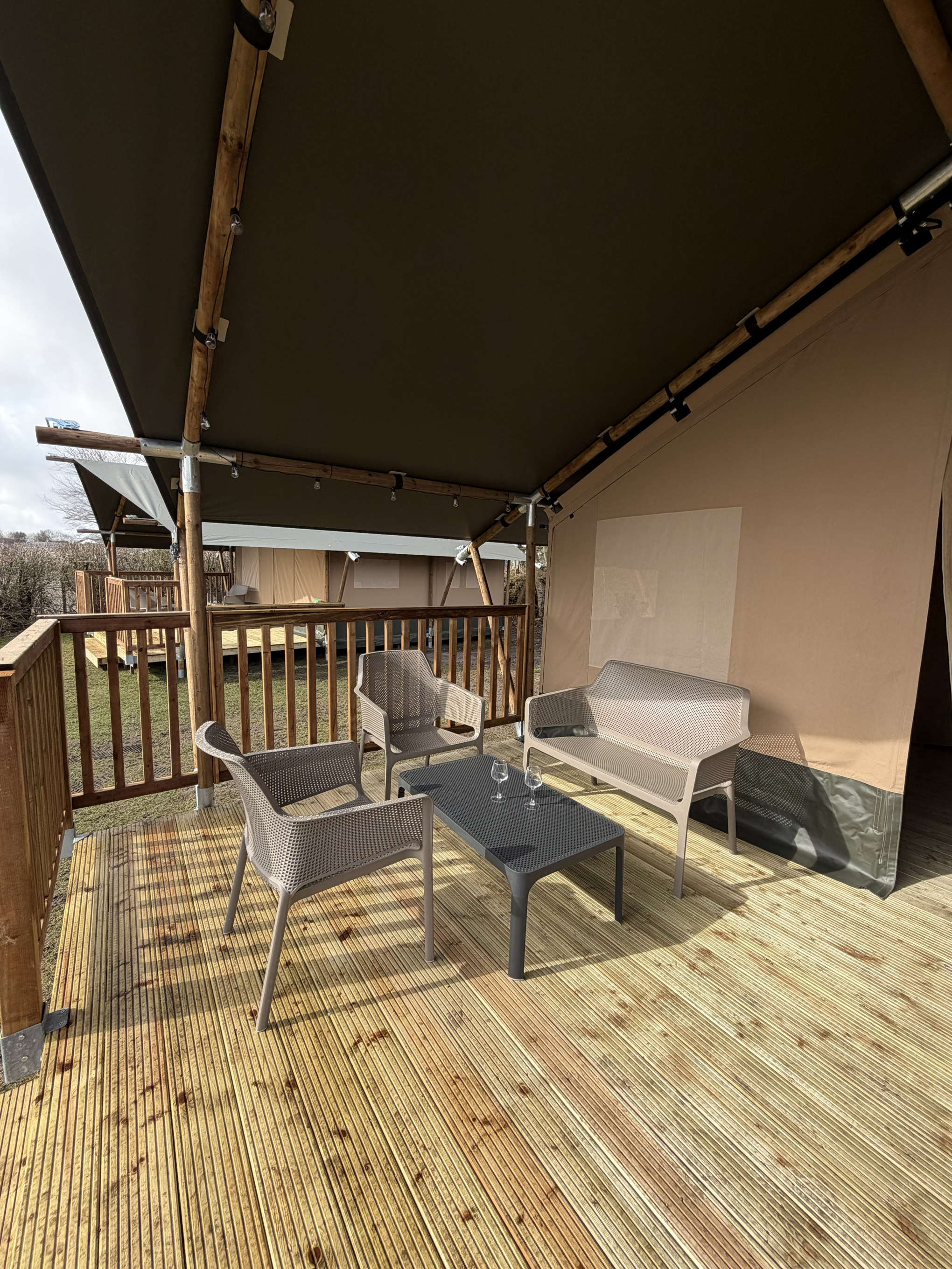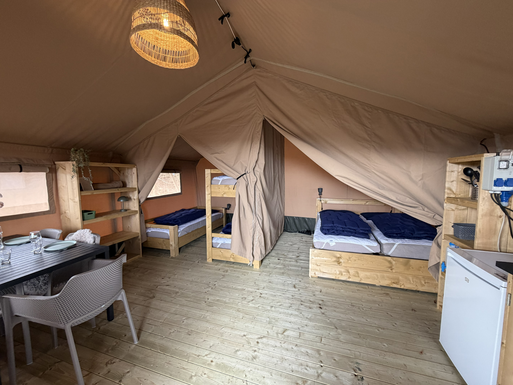 Til de gæster, der søger ekstra komfort, har vi moderne luksushytter – to med udendørs spa – hvor I kan nyde naturen fra første parket og koble helt af under åben himmel.