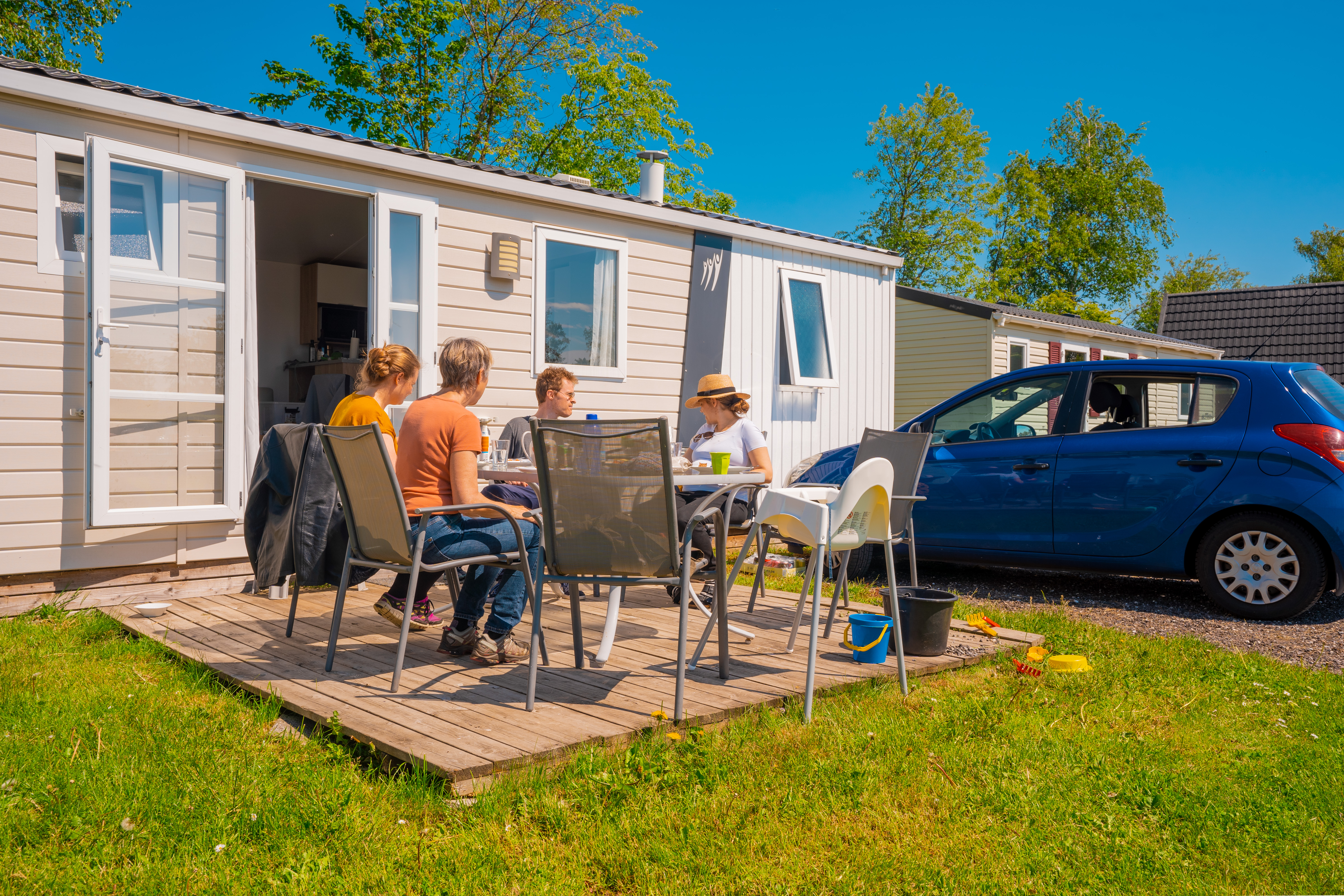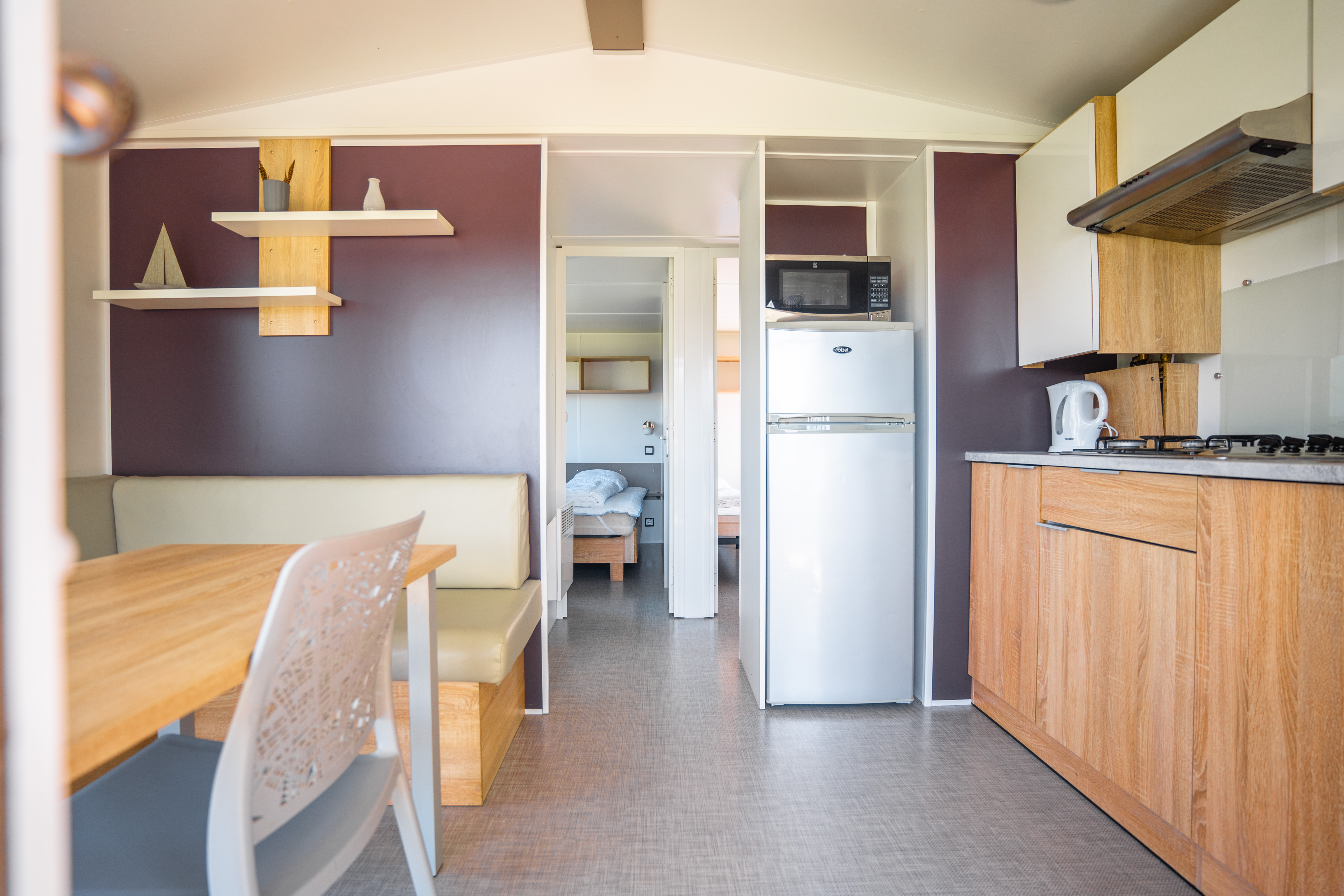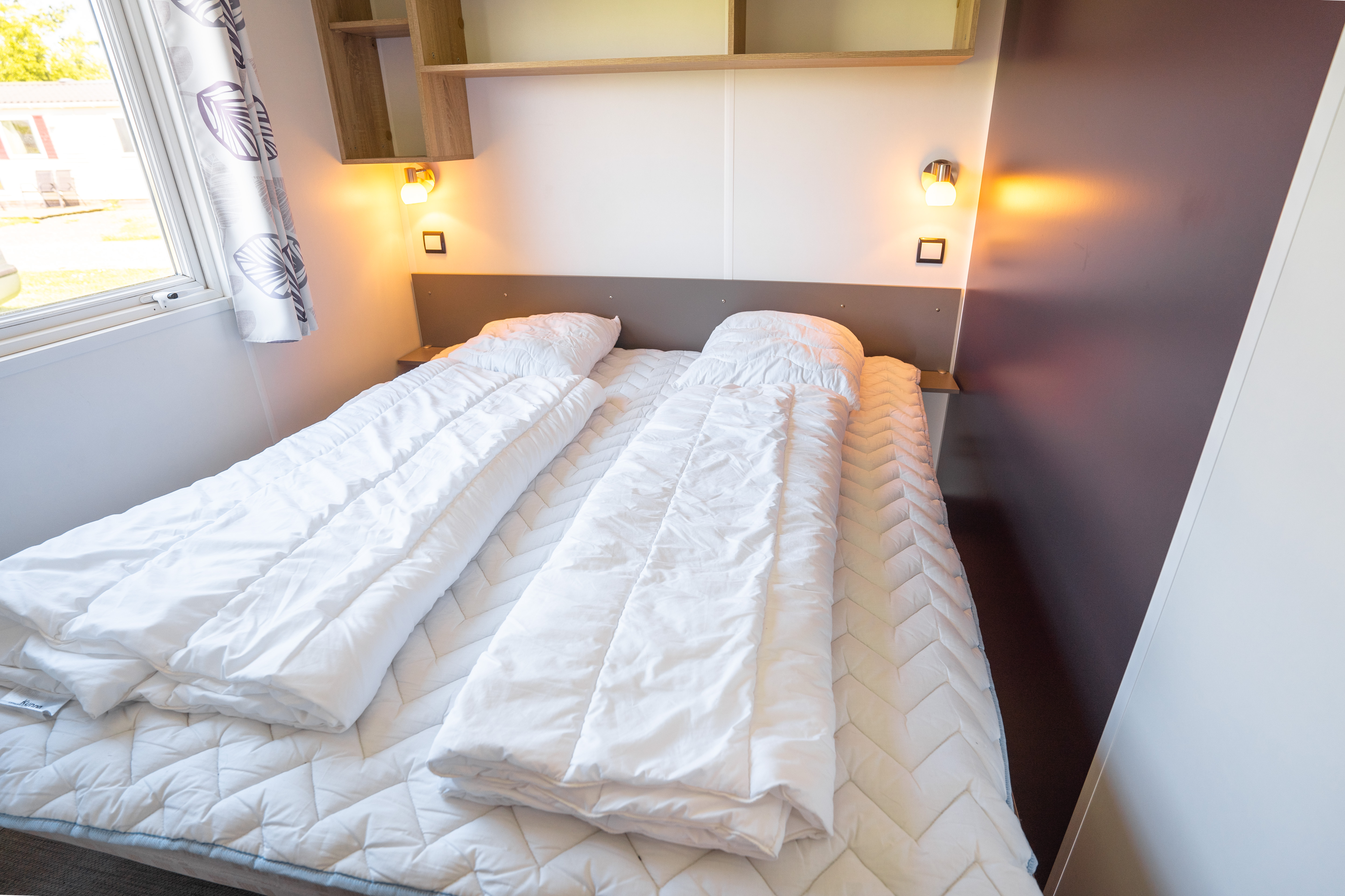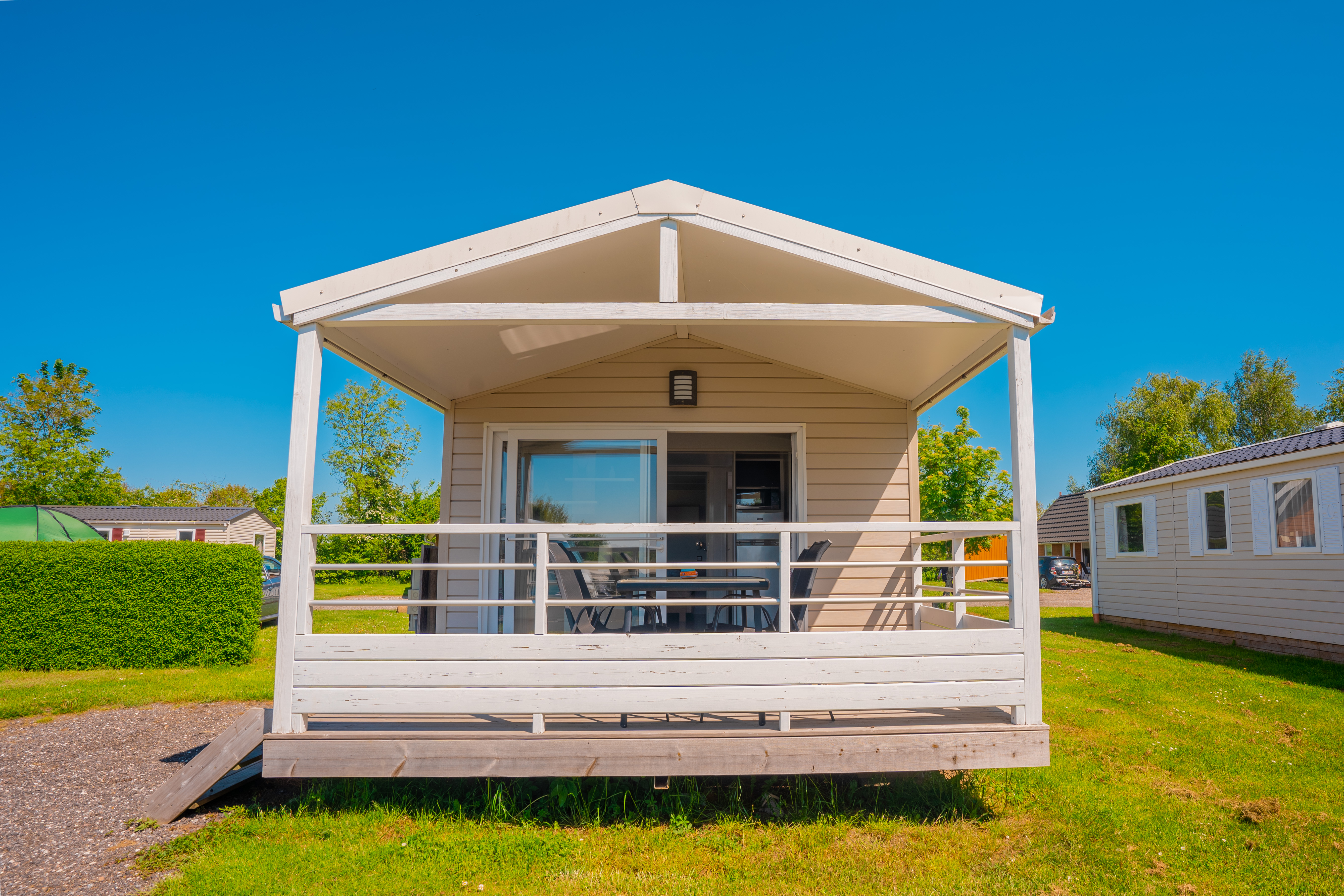 Vi udlejer lækre mobilehomes til 4-6 personer. De er på 26-34m2 med opholdsrum, 2 separate soveværelser, bad og toilet, køkkenalrum samt dejlig stor terrasse.
